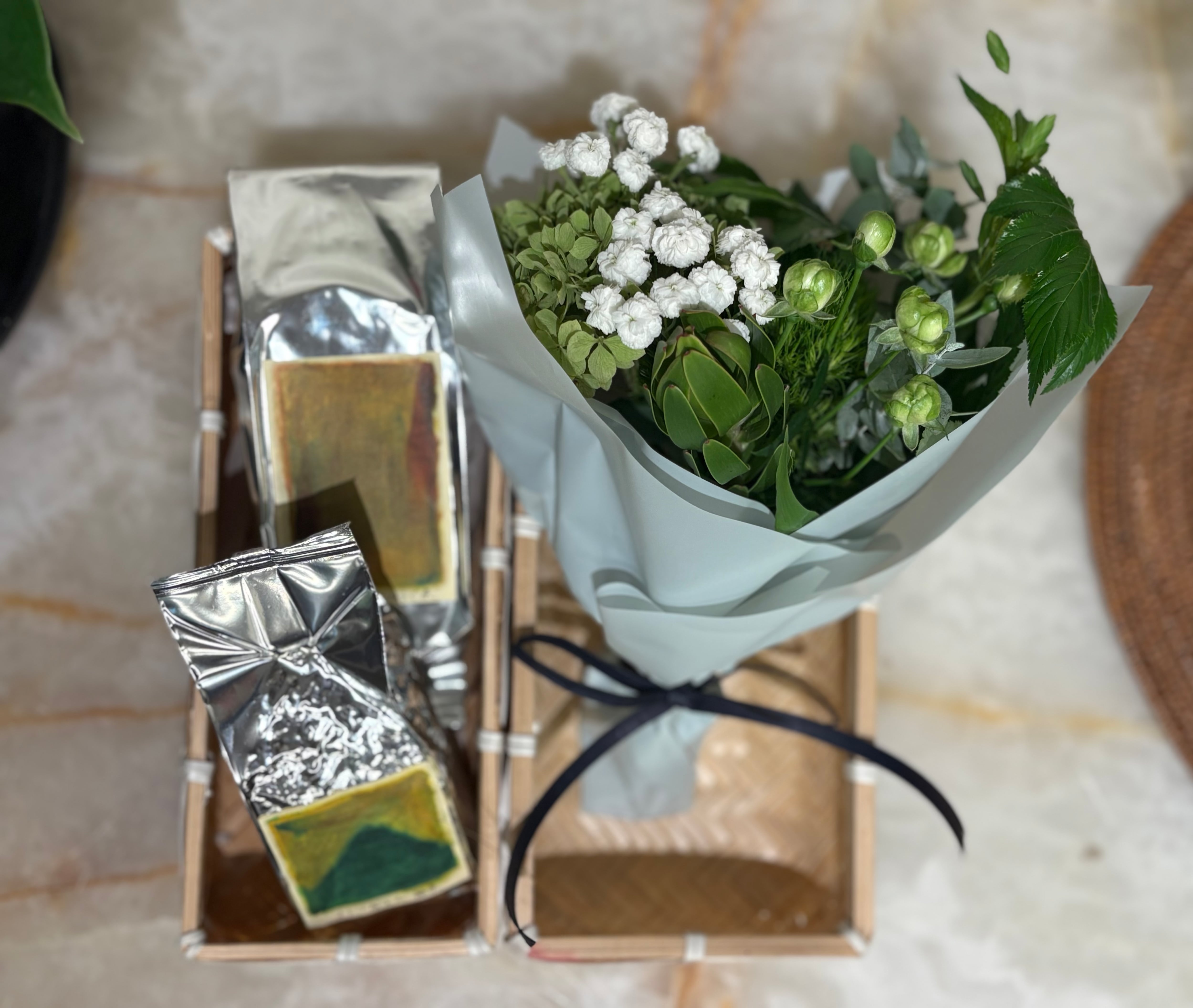 特別な夏の贈り物にぴったりな、新茶と季節のお花のセットをご提案します。上質な緑茶とほうじ茶の香りに 旬の花々が奏でるハーモニーが、贈る方の心を温かく包みます。新茶は岐阜県白川町ようけ成る山の有機栽培の茶葉を使用し、すっきりとした味わいが特徴です。