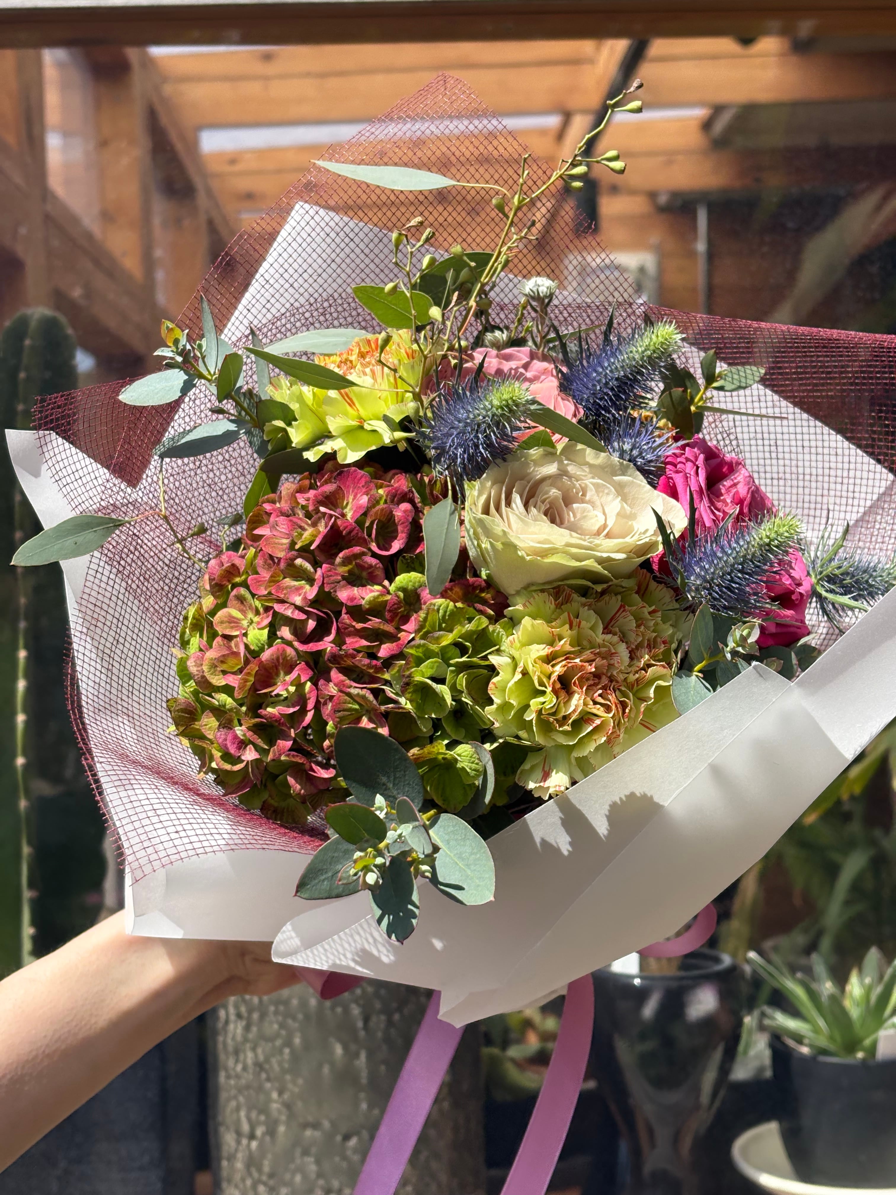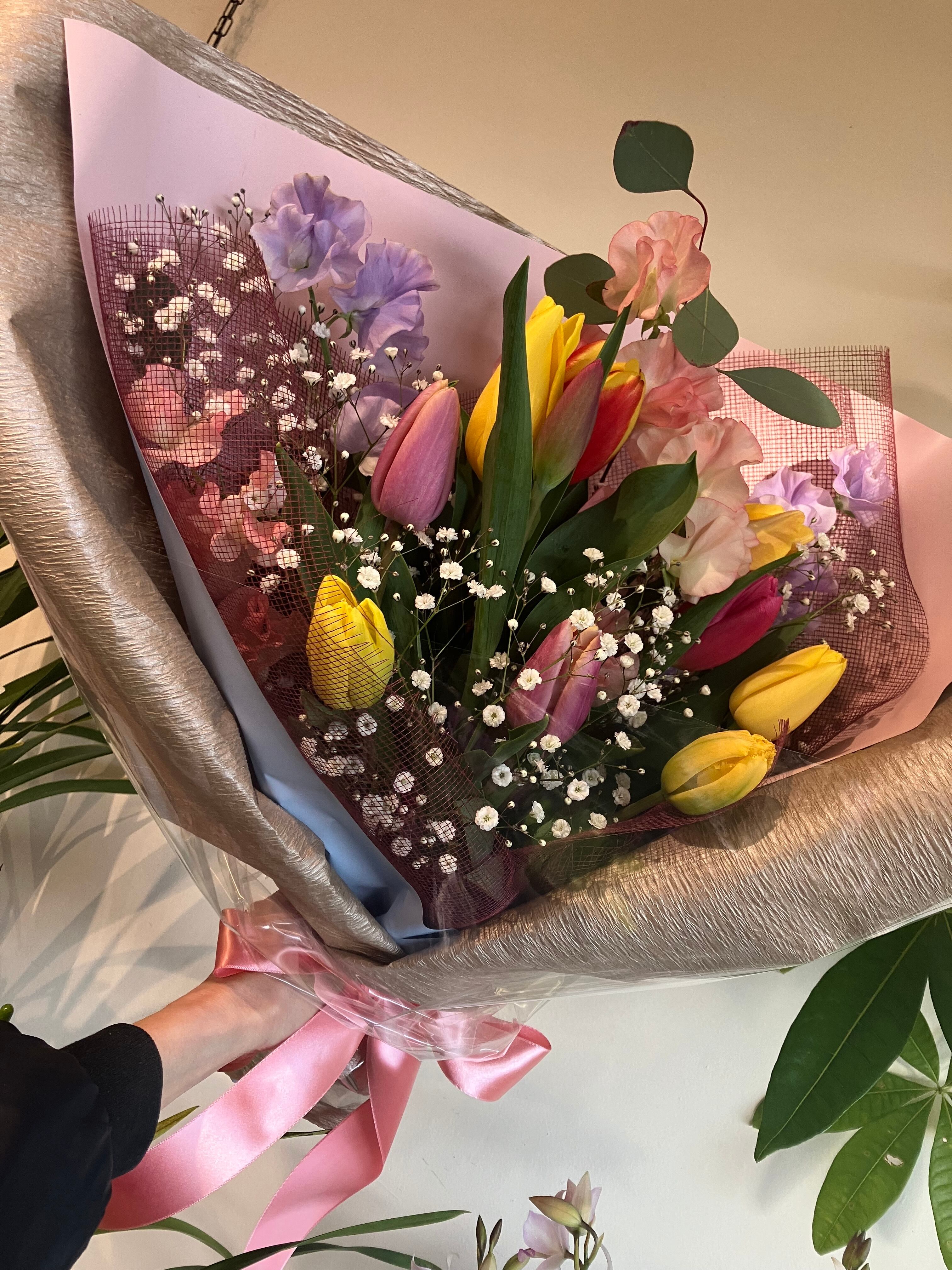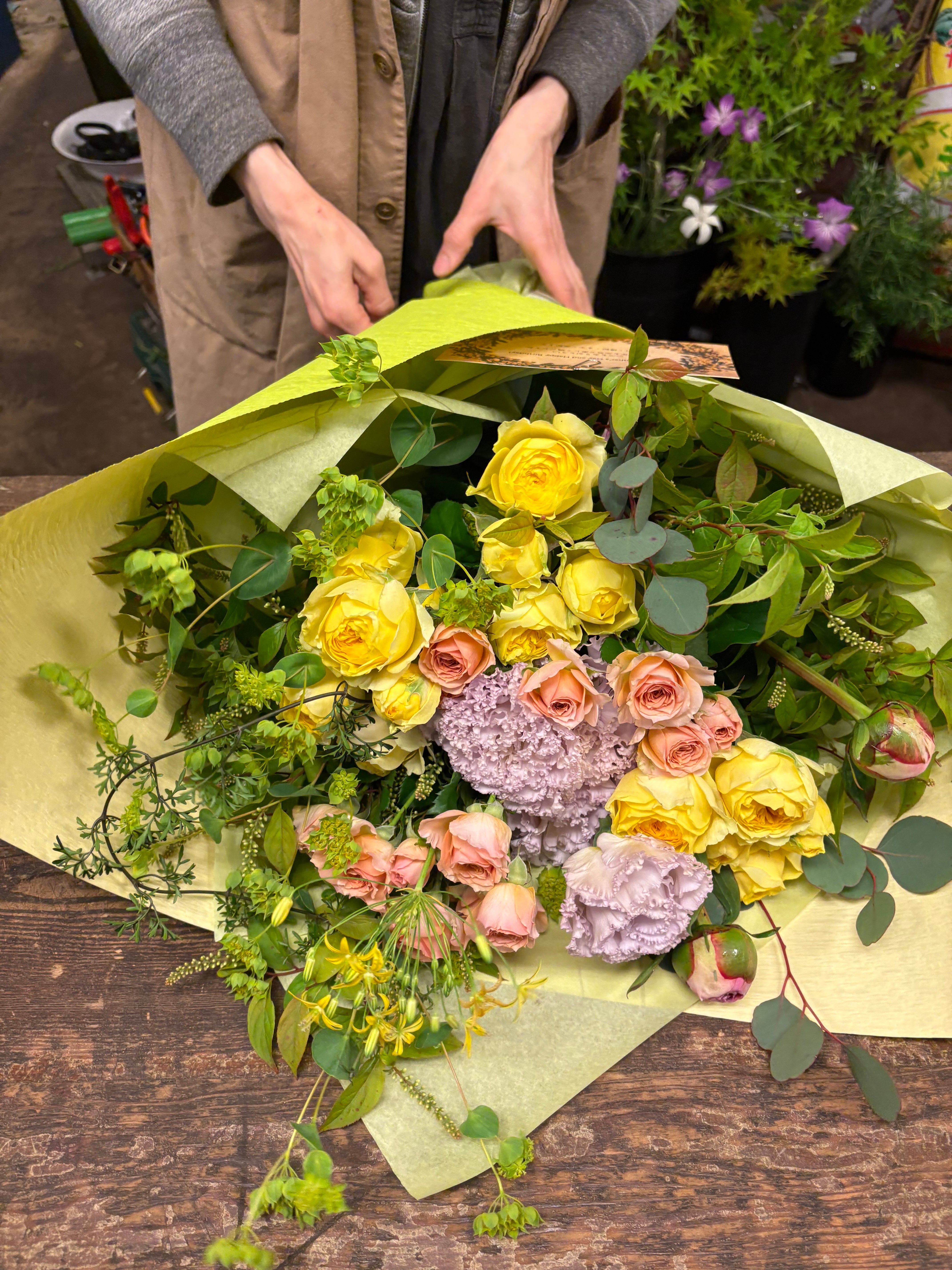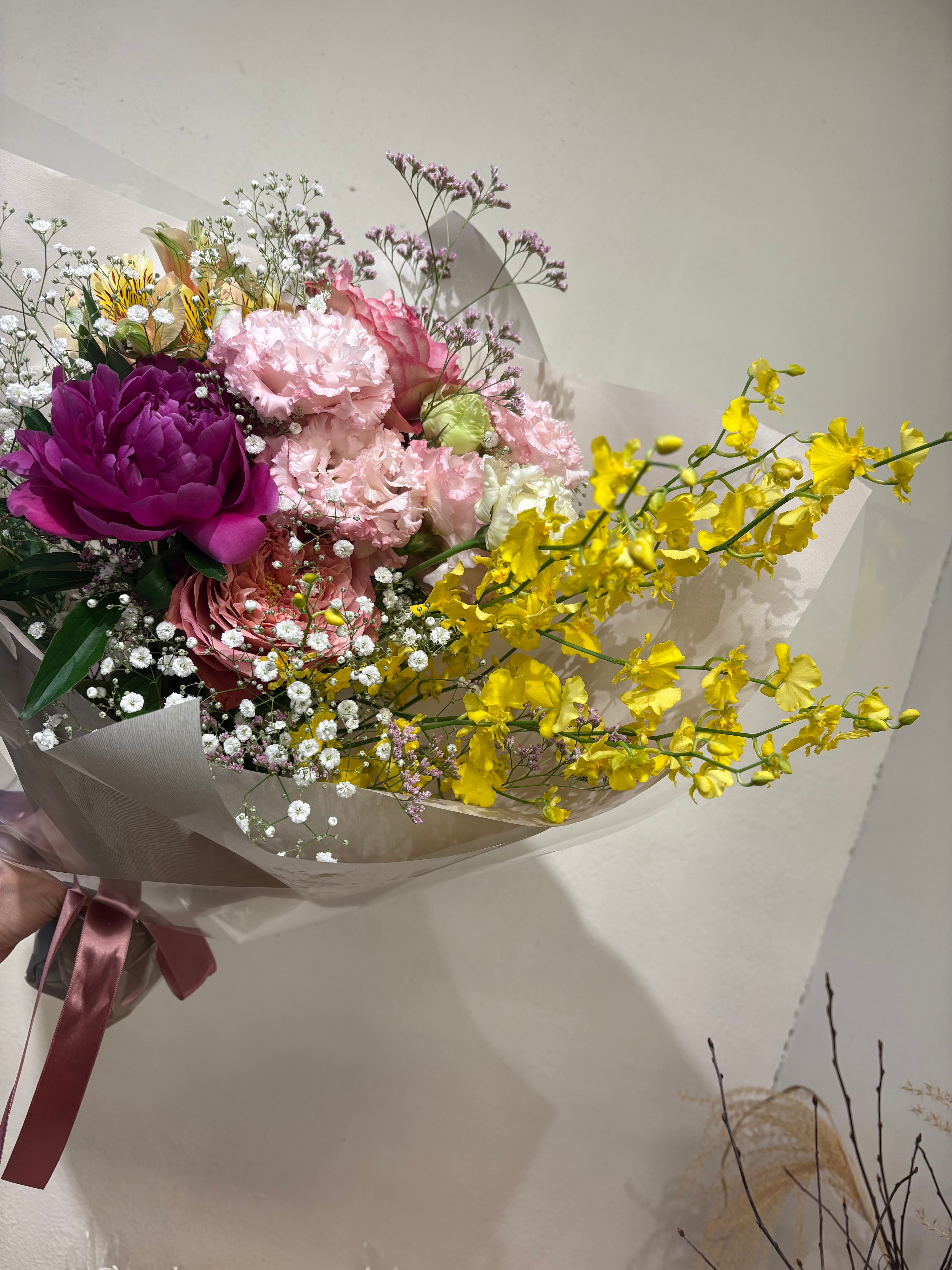 この愛妻 bouquetには、幸せの象徴カラーの黄色をポイントに色とりどりの花々をふんだんに使用してお届けいたします。特別な瞬間を彩り、愛する人との思い出をより深く刻むお手伝いをいたします。