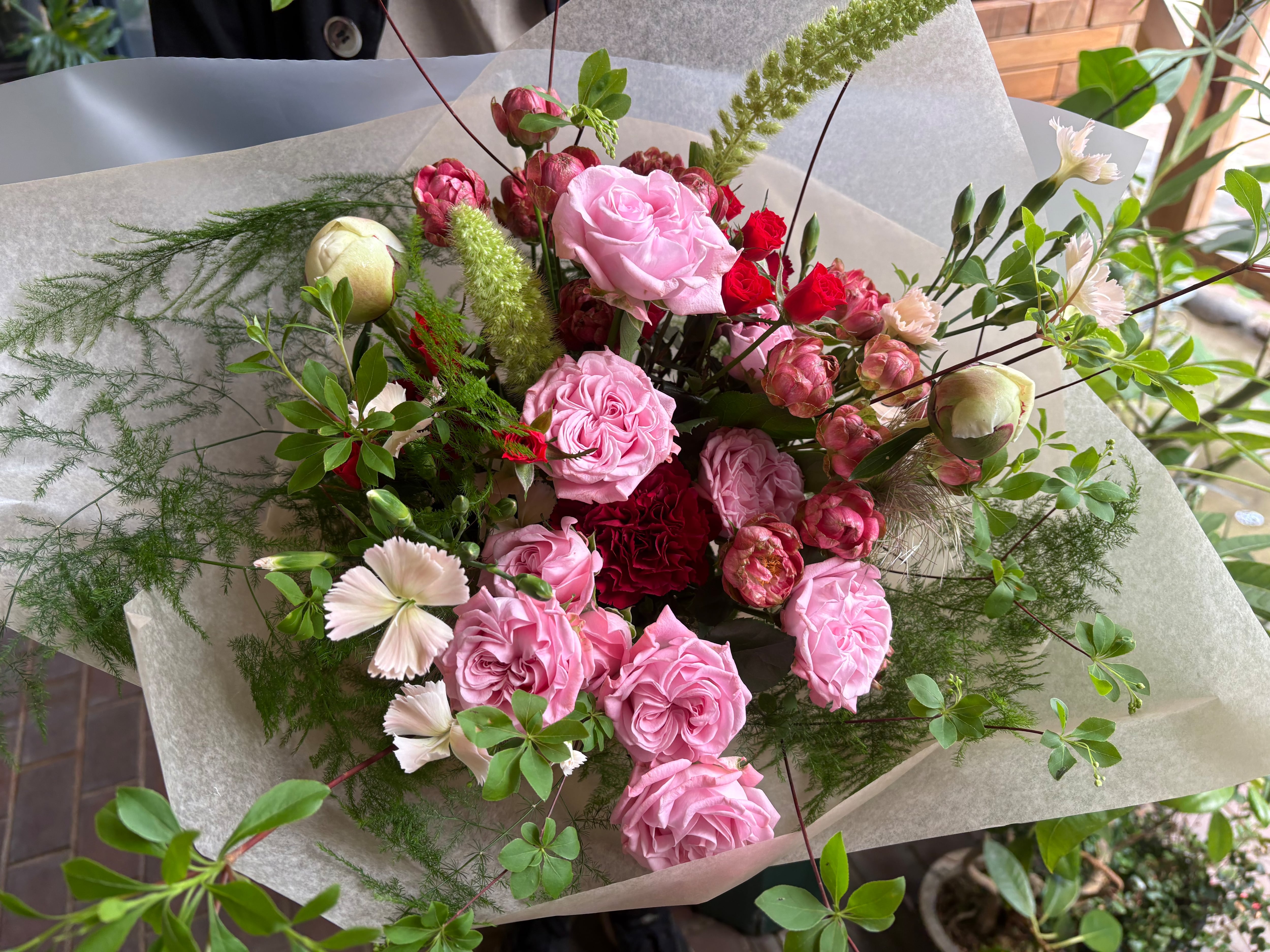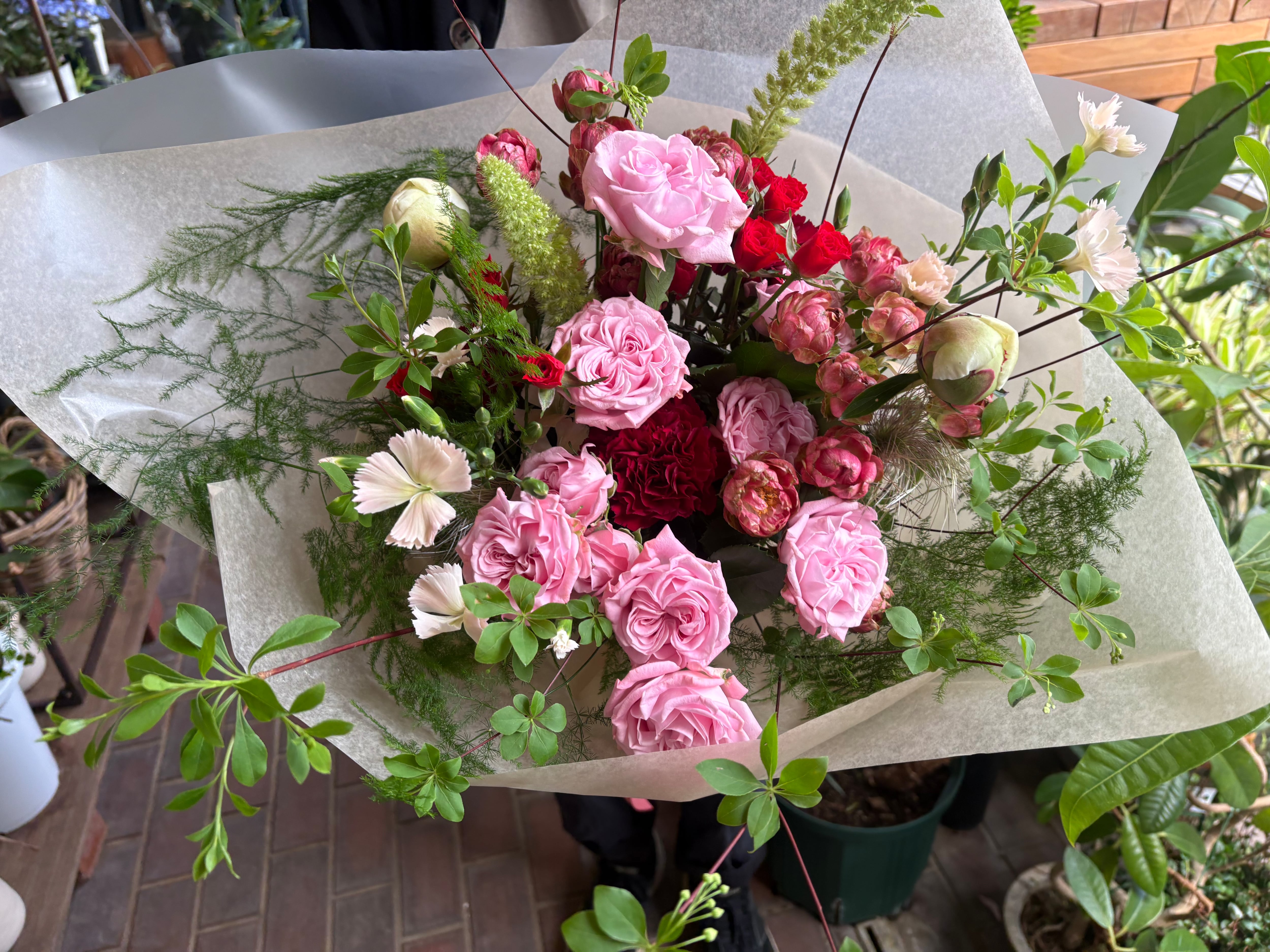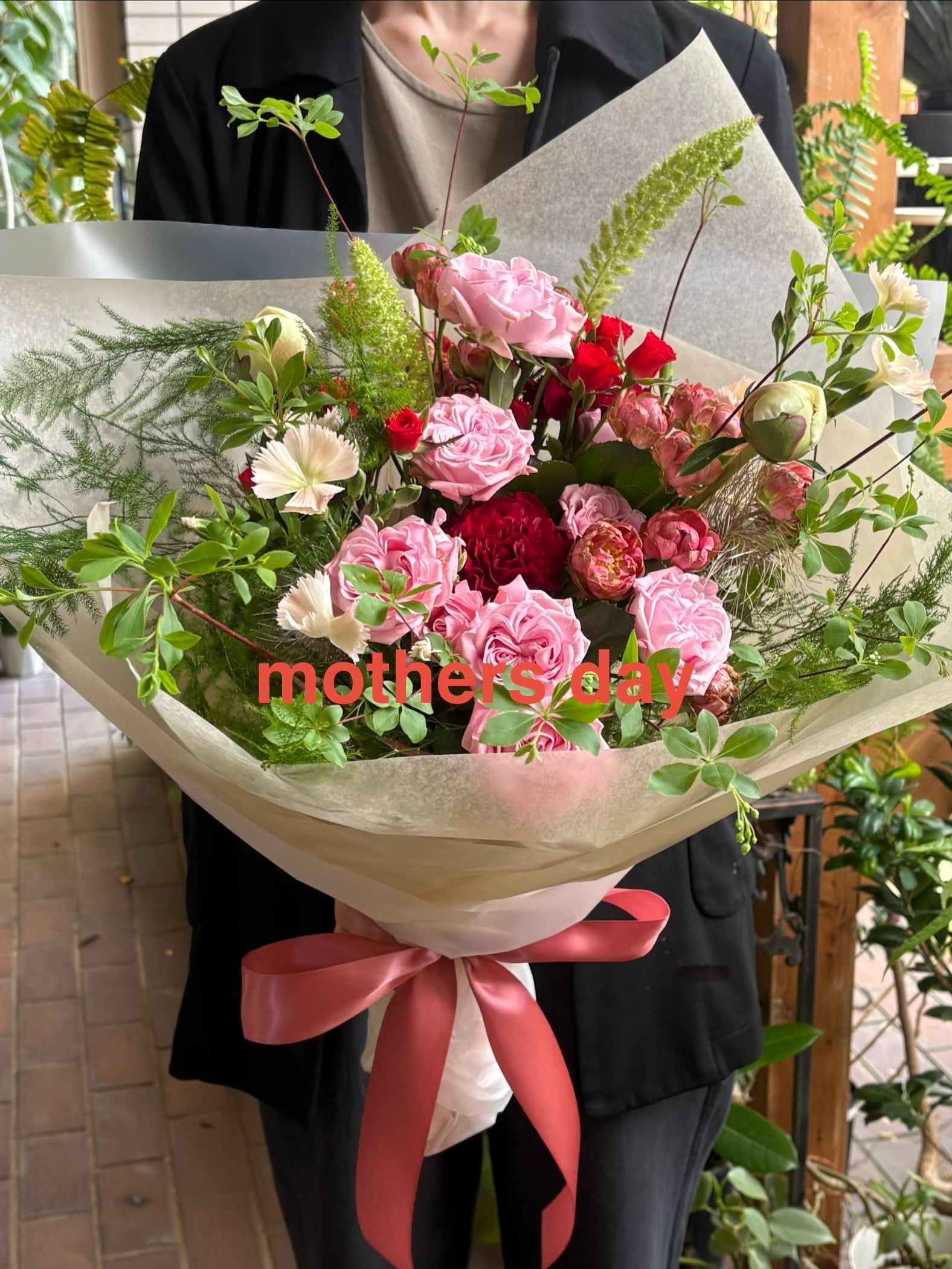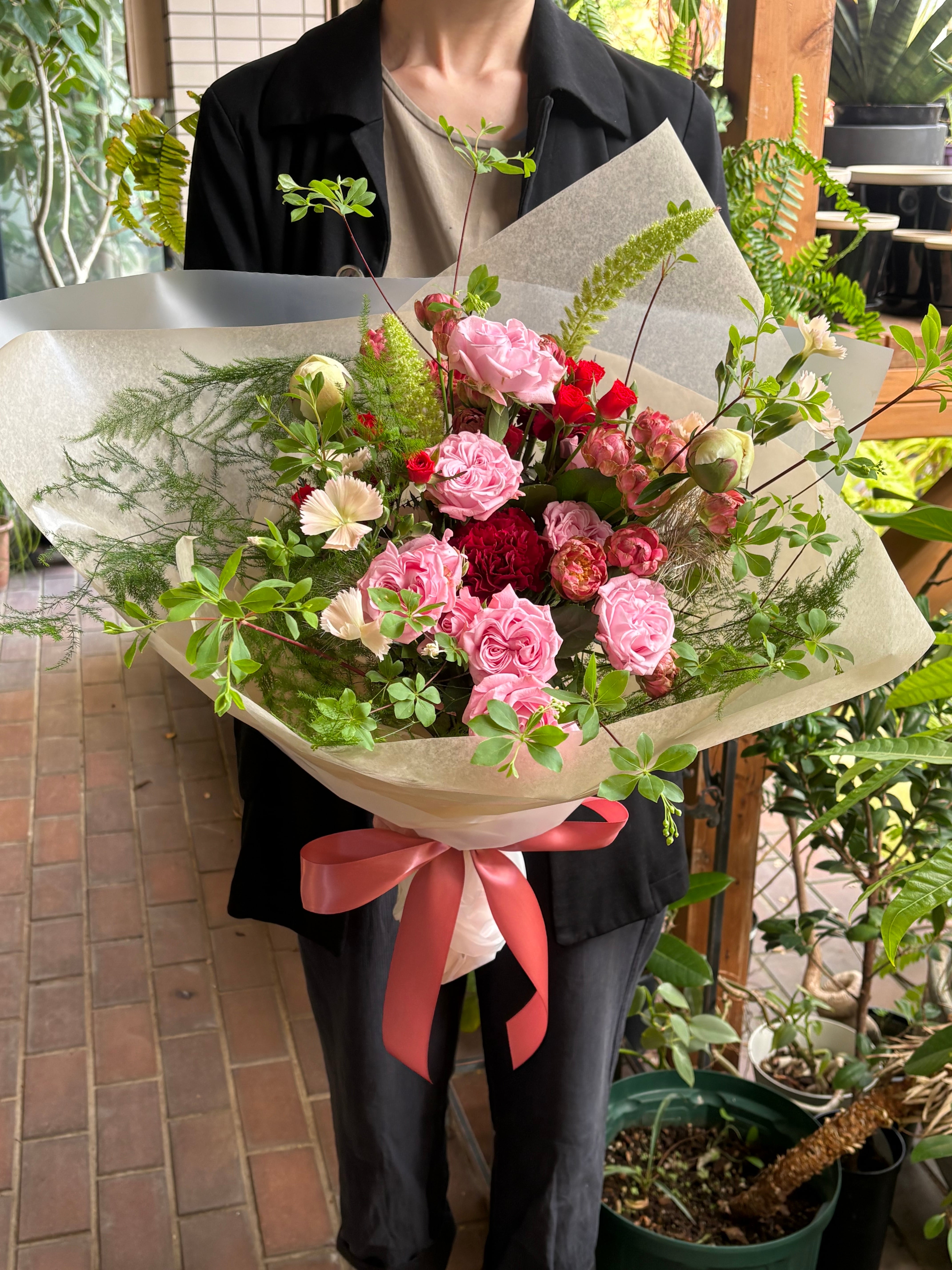 ■mothers day 花束 NO1 母の日のお祝いにぴったりなmothers day 花束 をお届けいたします!鮮やかな色 個性豊かなバラの花々が、感謝の気持ちを込めた贈り物として、大切なお母さんへの愛情を美しく表現します。 市場の仕入れ状況により花材が変更になる場合がございますが、全体の雰囲気は崩さずに制作いたします。 花束のサイズ 幅40㌢✖️高さ50㌢ 大切な方への感謝の気持ちを込めて、この花束をお選びください!